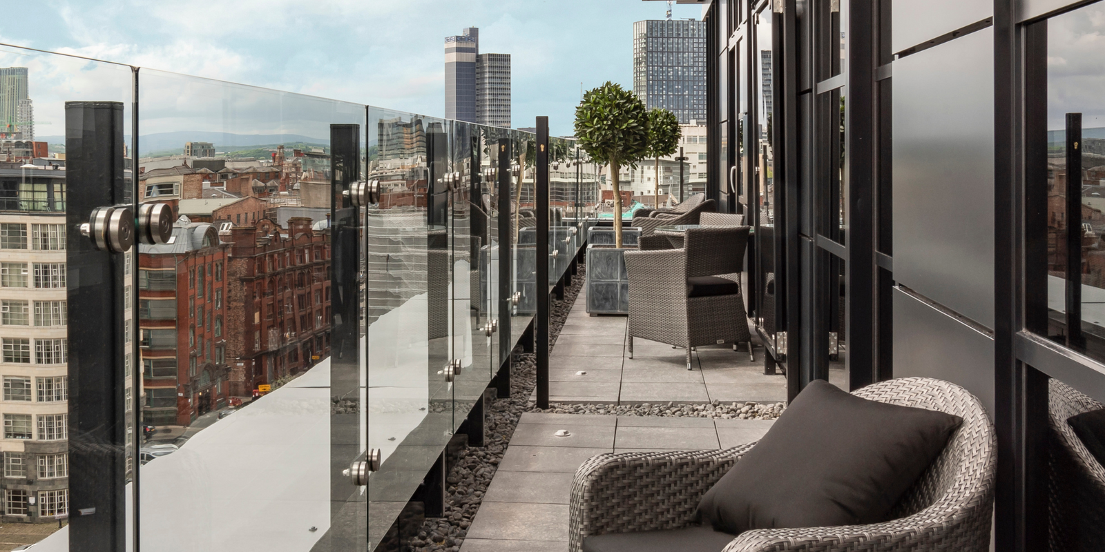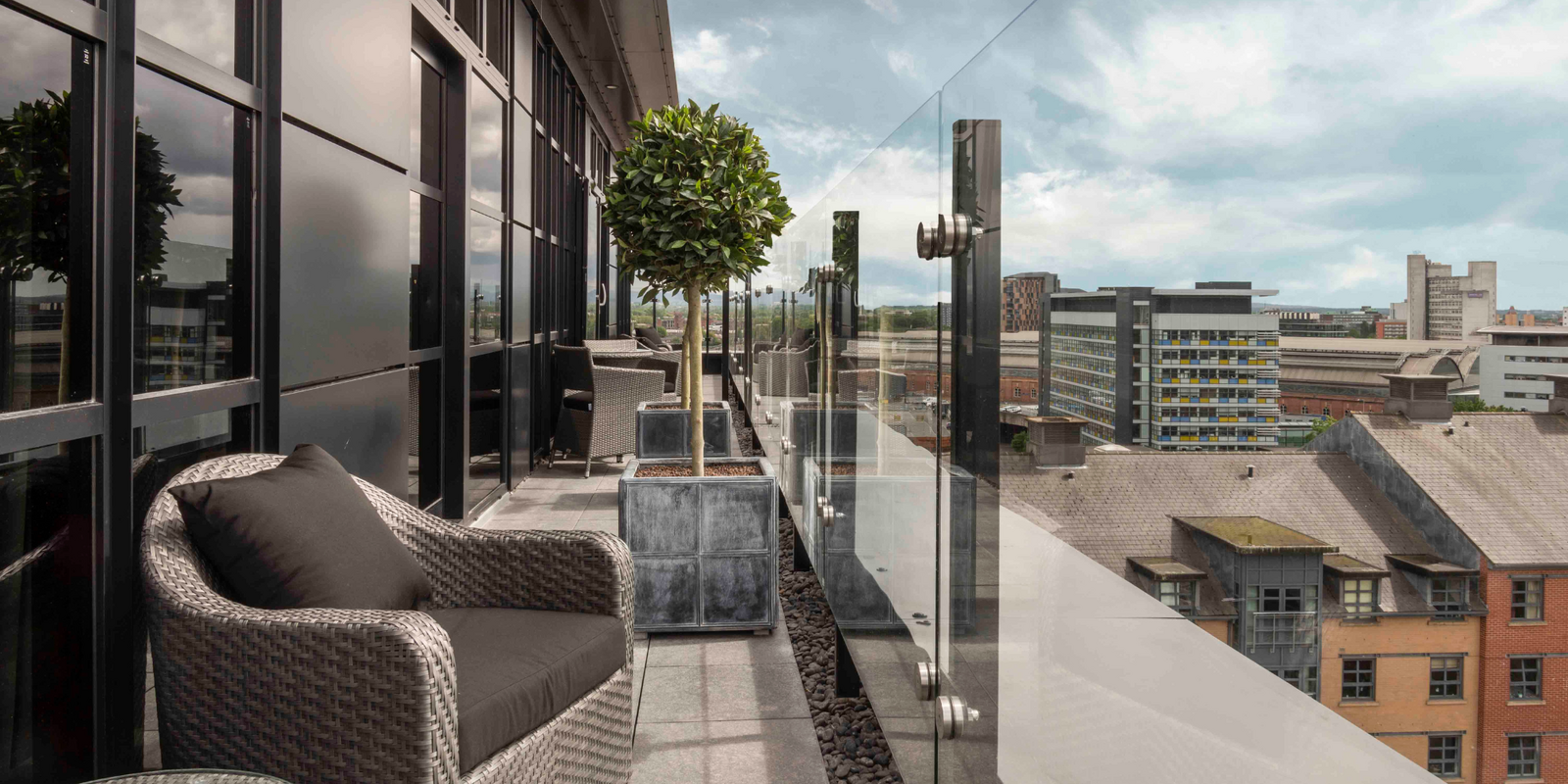 As you enter, floor-to-ceiling windows reveal panoramic views of Manchester’s vibrant cityscape. Stepping onto your own private wrap-around balcony, you’ll find an idyllic setting to savour moments of bliss amidst the city’s enchanting lights.