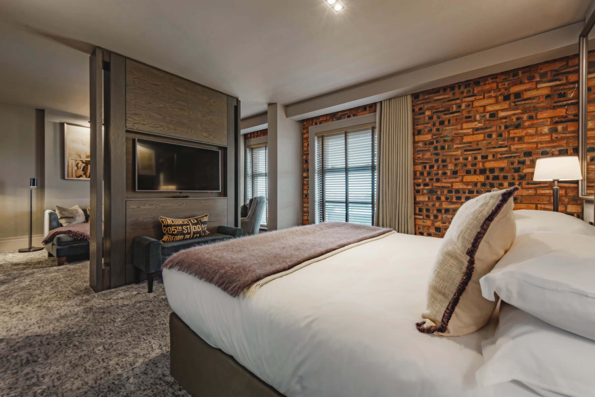 Indulge in luxury with a super-king size bed, separate bath, walk-in wardrobe, and stunning views of the Forth Rail Bridge. Includes private living room with two smart HDTVs, stocked mini-fridge, Nespresso machine, evening turndown and more.