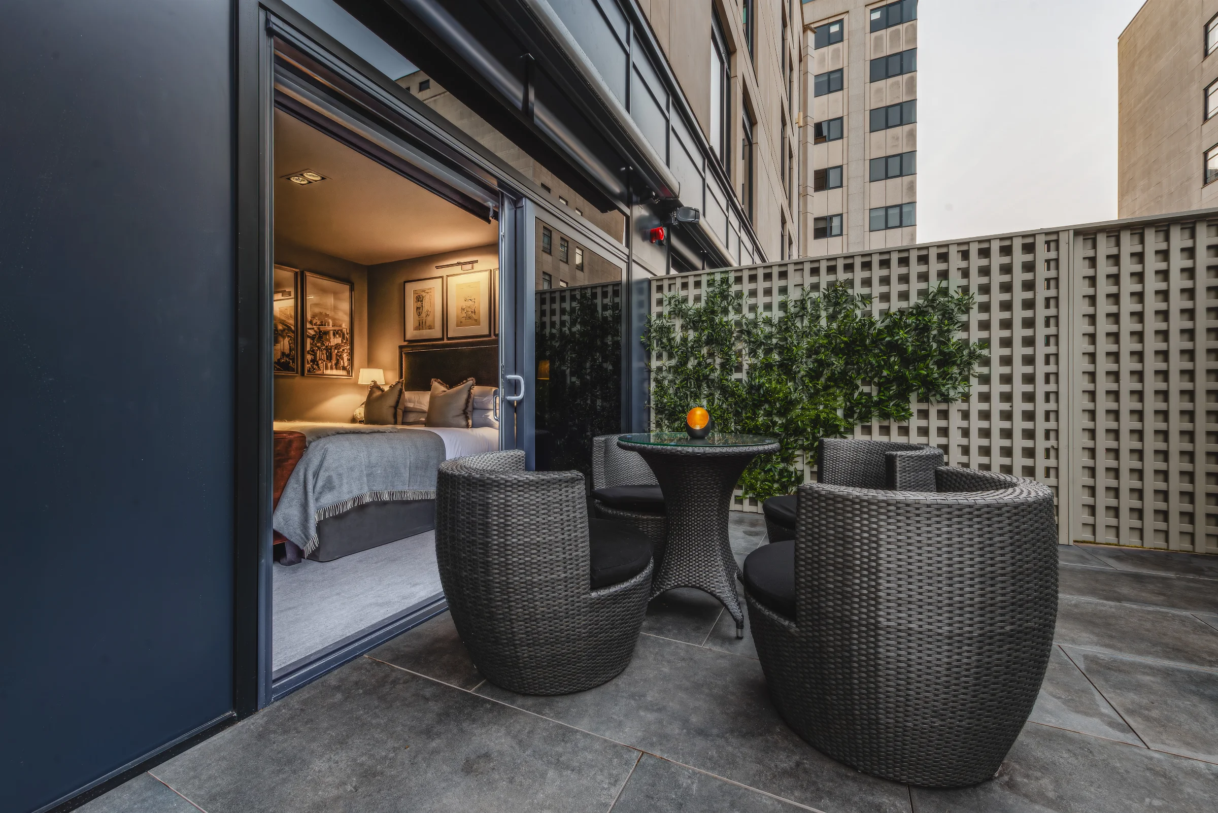 A luxurious suite on the first floor, with a spacious outdoor terrace overlooking Greek Street. Includes a sumptuous Super-King size bed, luxurious marble-top bath and rainfall shower.