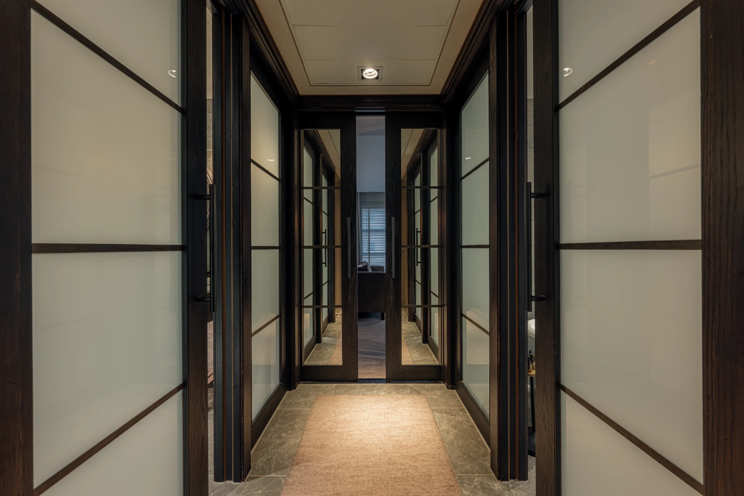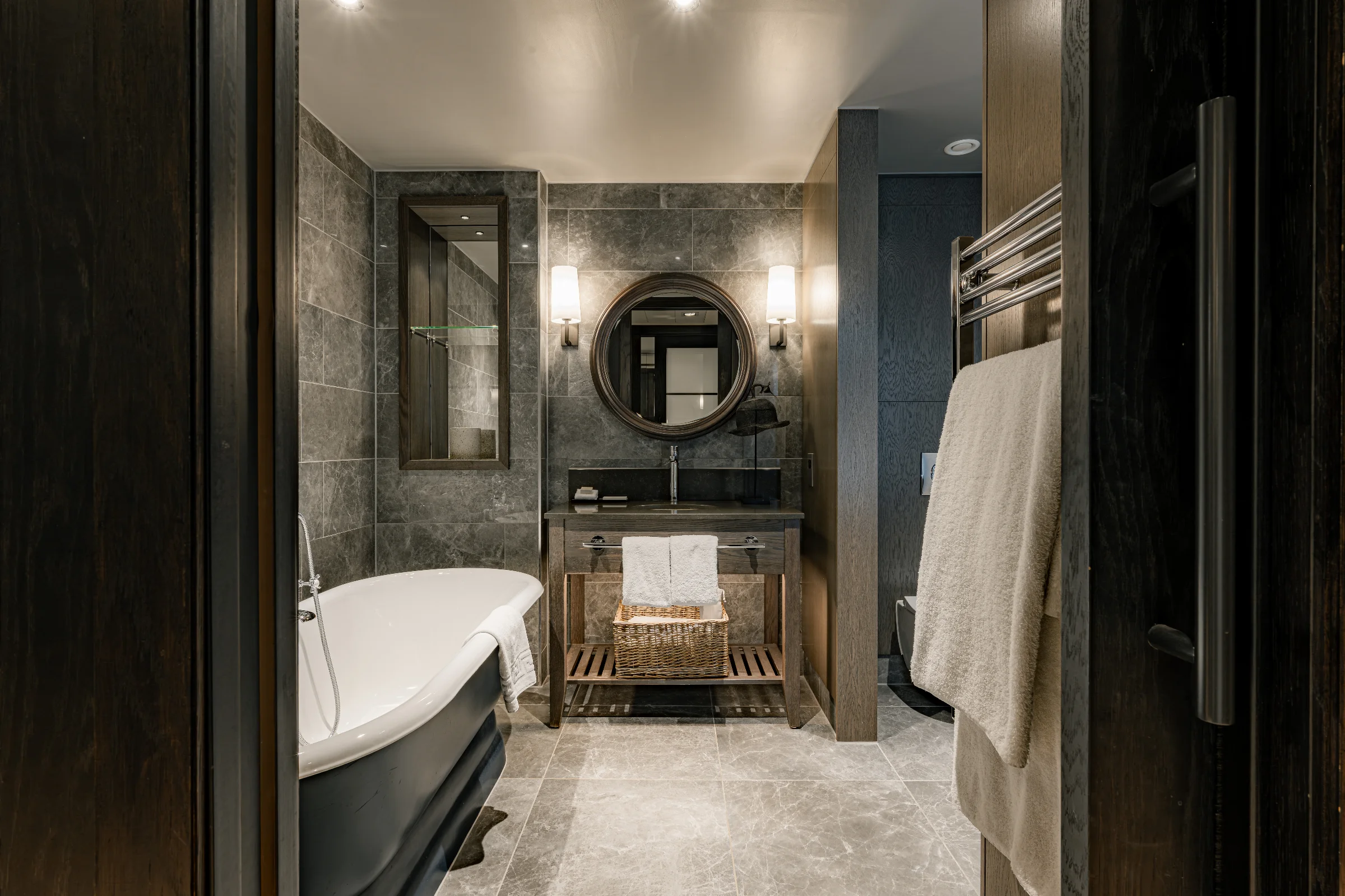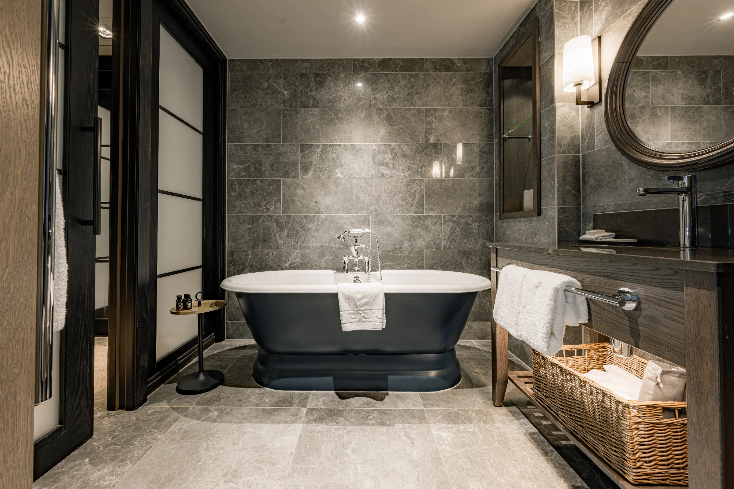 A stunning open-plan corner suite, featuring a spacious walk-through double bathroom, with luxurious roll-top bath and separate shower.