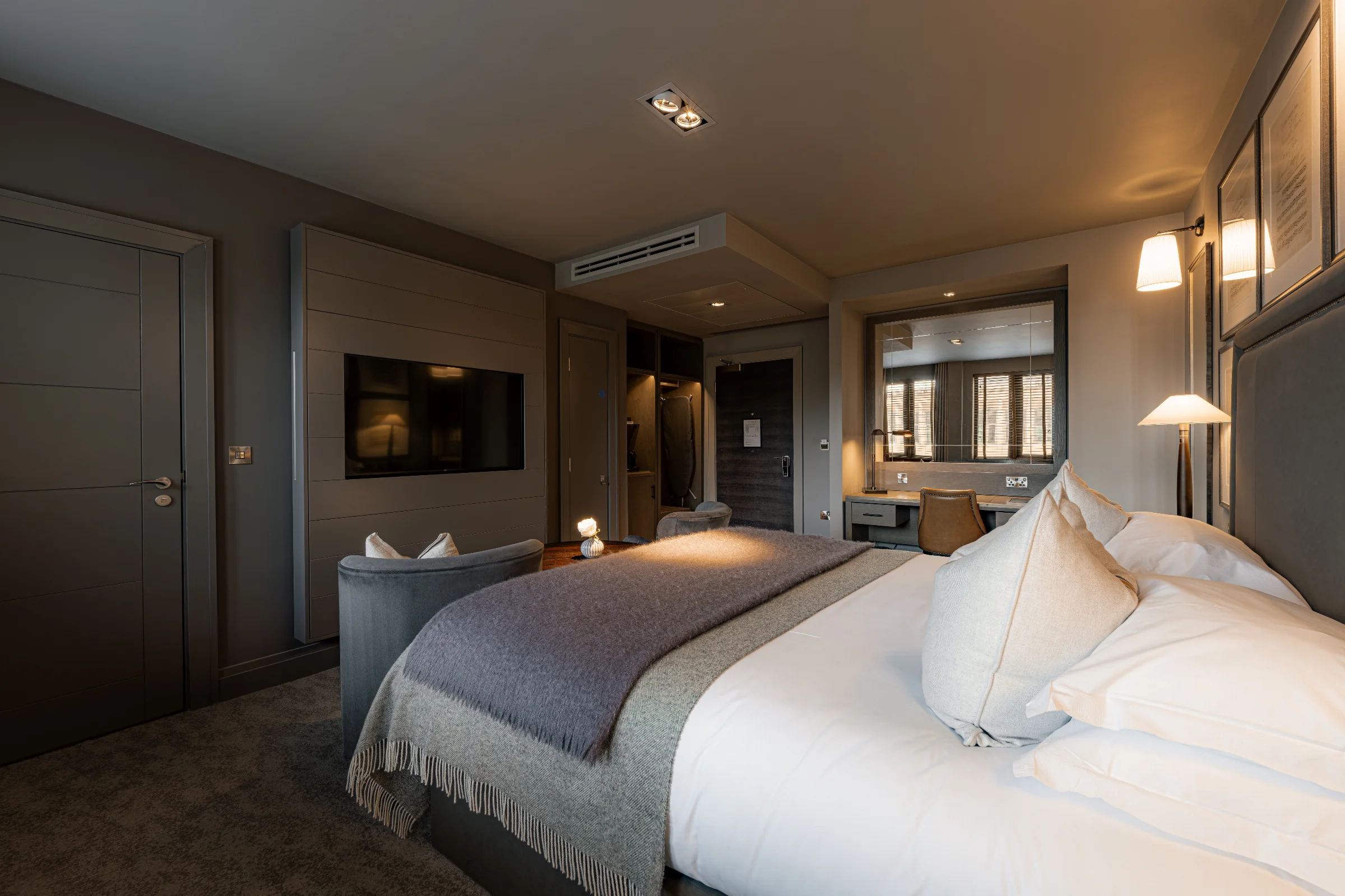 Our Classic Double Rooms With a View offer comfort and style with crisp cotton linens, luxury toiletries, and a rainfall shower, all with stunning views of the Quayside. Ideal for relaxation, these rooms include complimentary high-speed Wi-Fi and an Apple TV with Sky Sports.